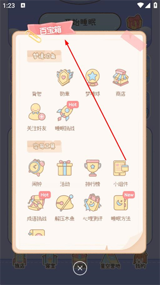 1、進入軟件后可打開百寶箱,查看背包、勛章、夢氣球、商店等功能入口,還有鬧鐘、活動、排行榜等專屬工具,選擇需要的功能使用。