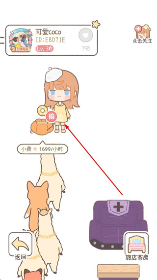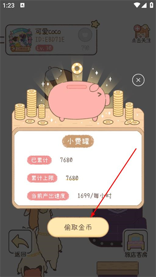3、進入其他用戶的夢境旅店如可愛coco的旅店,可查看其等級、小費罐等信息,了解小費產出速度,準備偷取金幣。