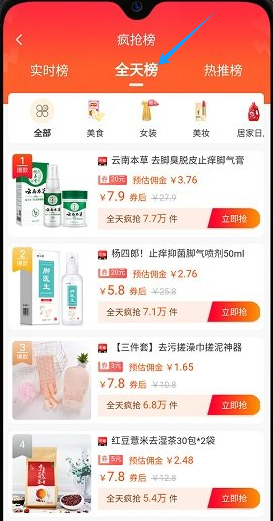 1、全天榜頁面,分實時、全天、熱推榜,展示美食、女裝等多品類商品,標注預估傭金與銷量。