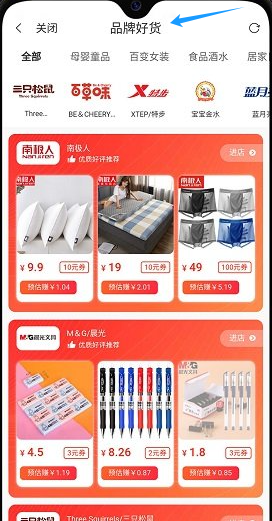 2、點擊品牌好貨頁,涵蓋母嬰、食品等多領域品牌,如三只松鼠等,呈現商品價格與預估傭金。