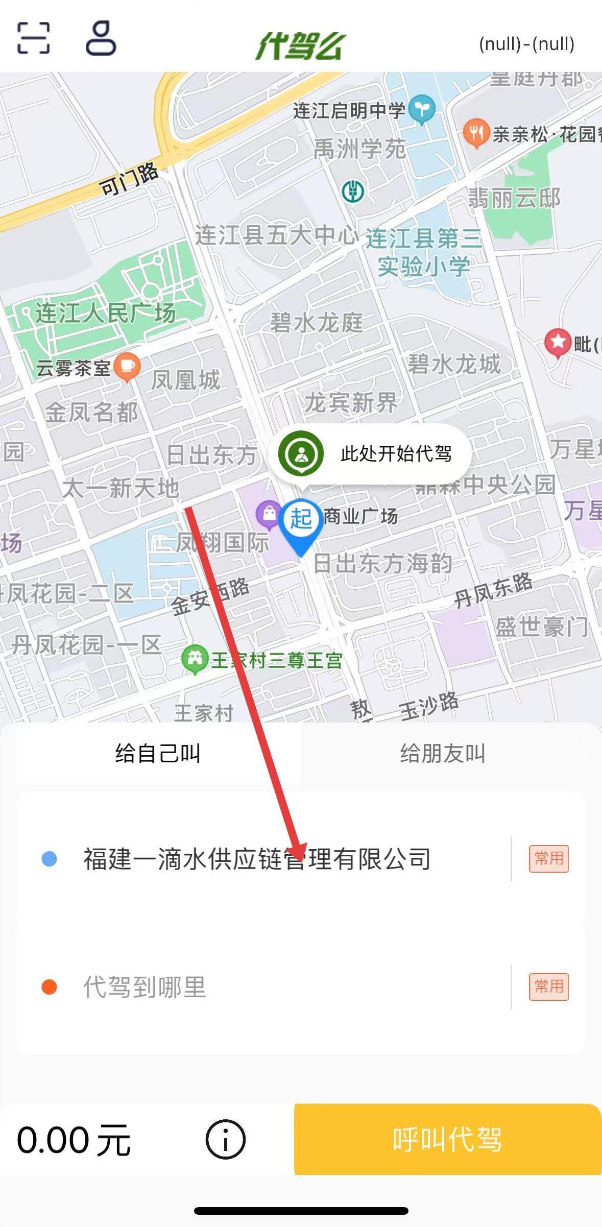 2、代駕界面,地圖上顯示了起始位置,用戶可選擇給自己叫或給朋友叫代駕,輸入目的地后點擊呼叫代駕按鈕。