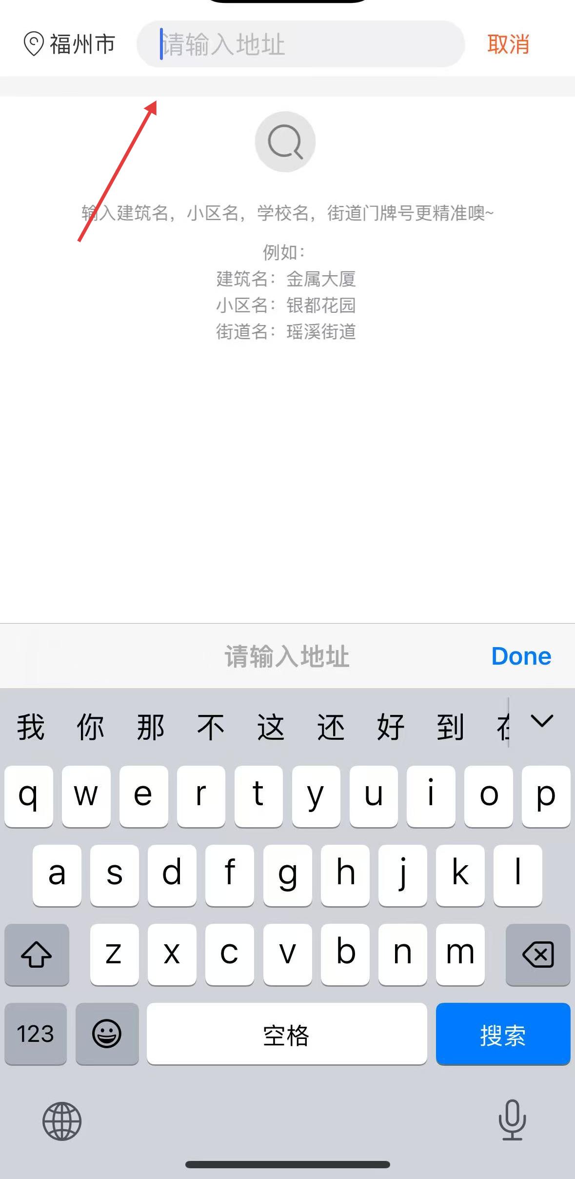 3、地址輸入界面,用戶可在搜索欄輸入建筑名、小區名等地址信息進行精準定位,方便查找相關地點。