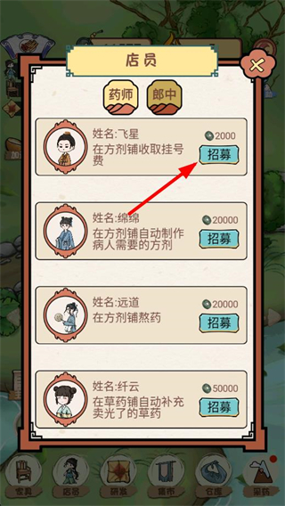 4、在店員界面,可招募飛星、綿綿、遠道、纖云等店員,不同店員有不同技能,如飛星可在方劑鋪收取掛號費,助力店鋪經營。