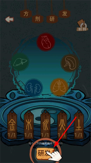 1、在方劑研發界面,可點擊研發按鈕,結合心、肝、脾、肺、腎等元素以及金、木、水、火、土等標識,研發新的方劑。