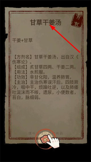 2、研發出甘草干姜湯后,可查看其出自傷寒論,由炙甘草四兩、干姜二兩組成,水煎服,有辛甘化陽、溫養肺胃的功效。