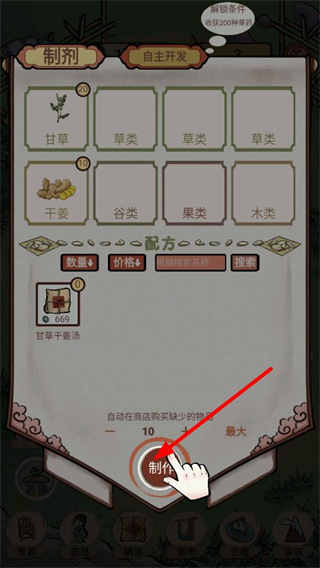 3、在制劑界面,選擇甘草干姜湯配方,點擊制作按鈕,可制作該方劑,同時可設置制作數量,滿足店鋪需求。