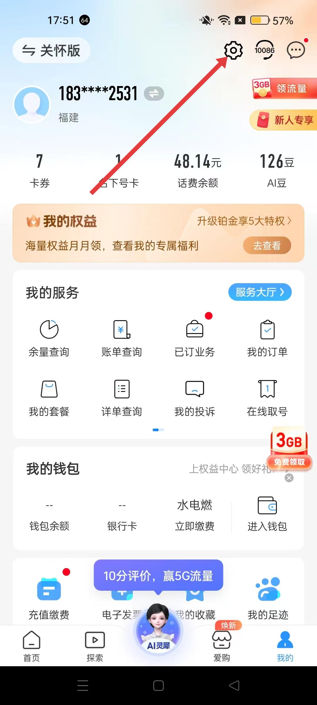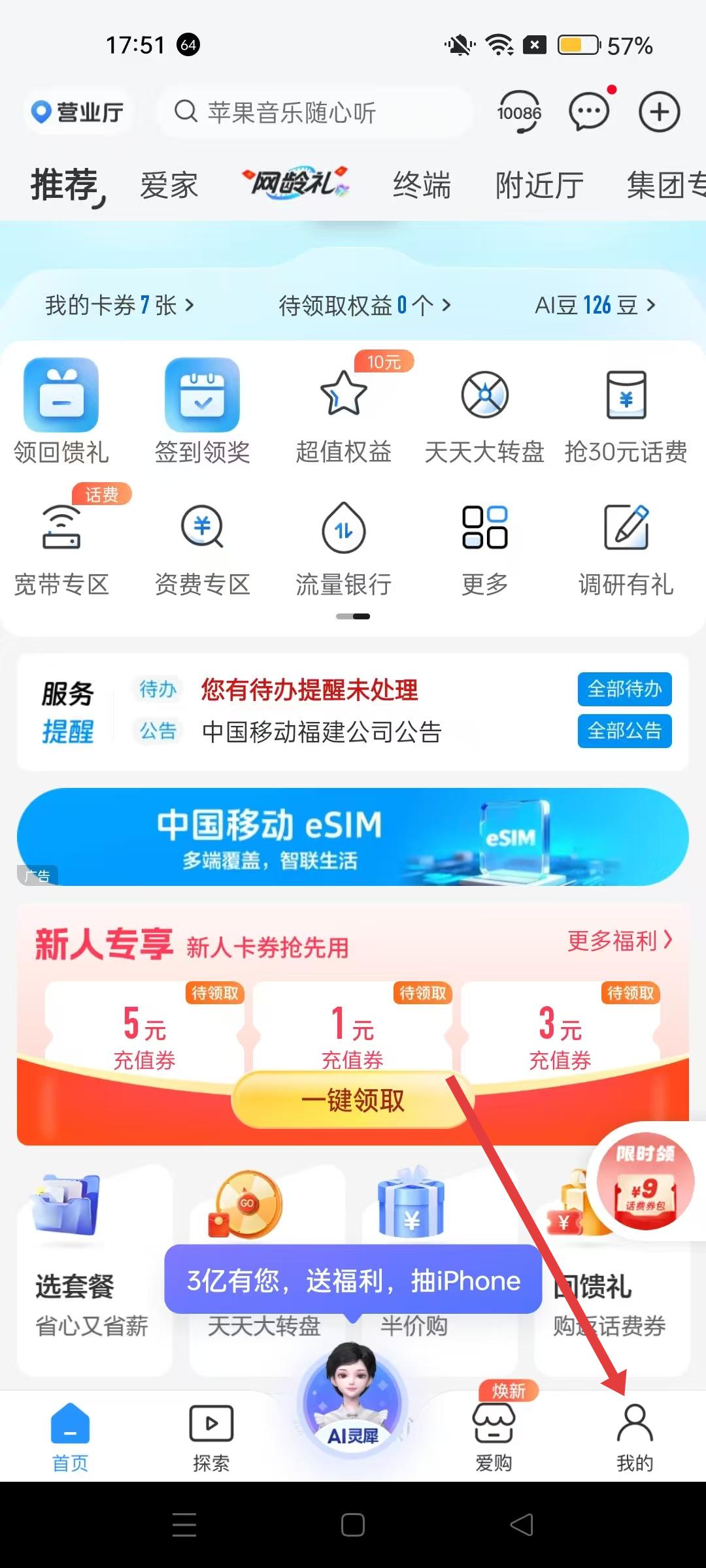 1、打開移動營業廳APP,首頁點擊右下角我的,進入個人中心頁面,開始賬號退出操作。