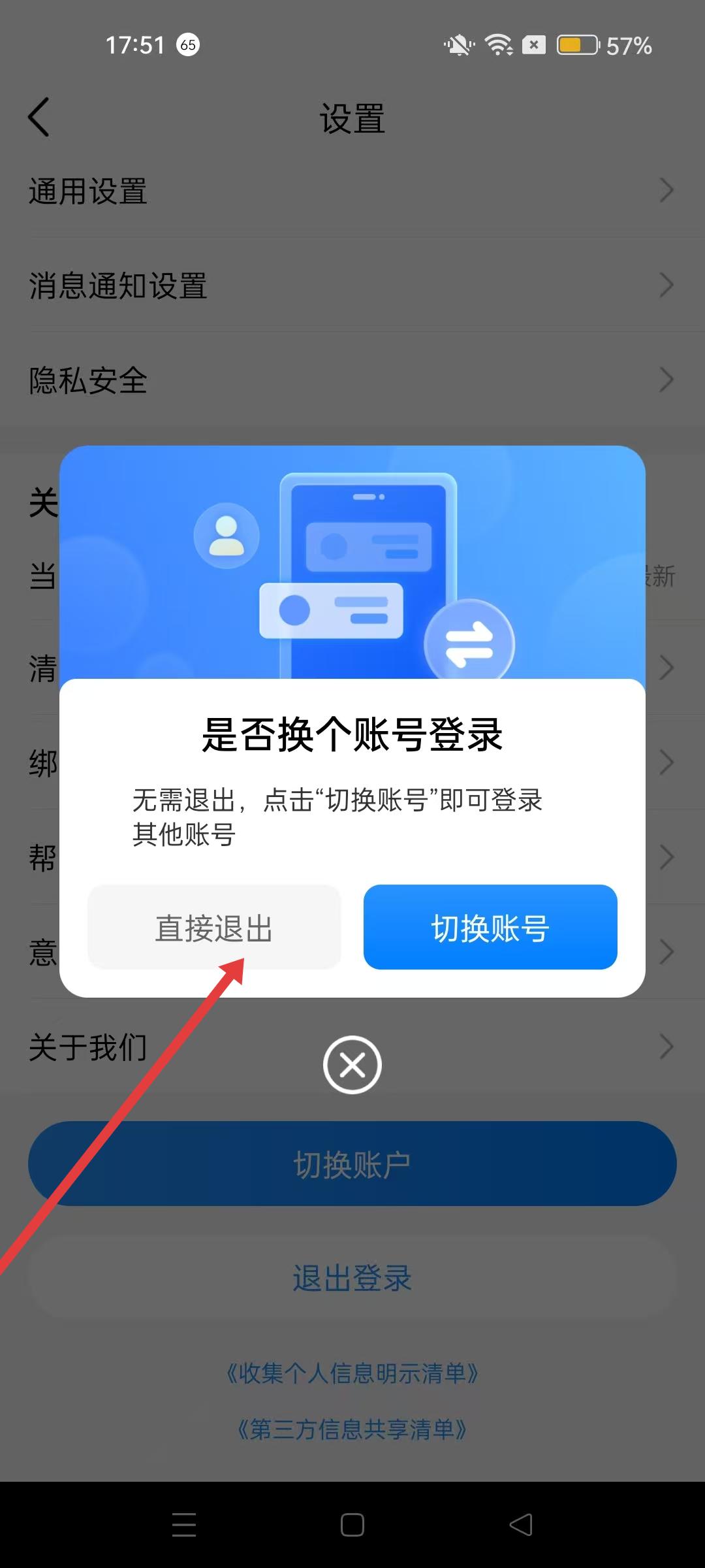 4、此時會彈出是否換個賬號登錄的提示框,點擊直接退出,即可完成賬號退出操作。