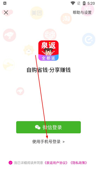 1、打開泉返購物軟件,進入登錄頁面,選擇使用手機號登錄選項,跳轉至驗證碼登錄。