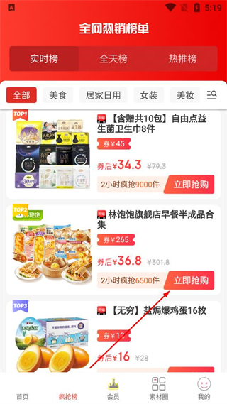 2、進入瘋搶榜頁面,切換淘寶、京東等平臺榜單,選擇實時榜、全天榜等,找到心儀商品如伊利金典純牛奶,點擊立即搶購。