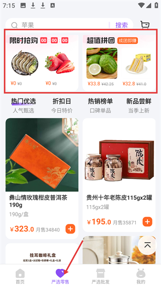 2、嚴選零售頁,有限時搶購、超值拼團板塊,還有熱門優選等分類,展示普洱茶、老陳皮等商品,滿足零售購物需求。
