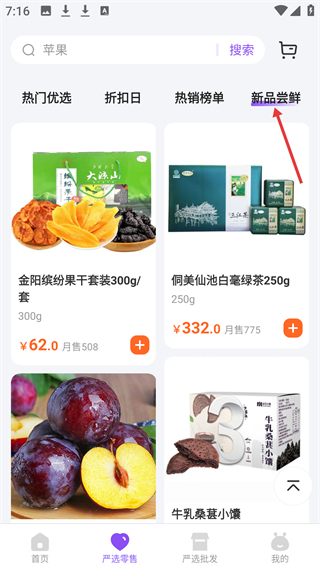 3、嚴選零售新品嘗鮮板塊,展示果干套裝、綠茶、李子、牛乳桑葚小馕等新品,供用戶發現當季上新特色商品。