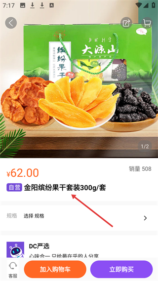 4、金陽繽紛果干套裝詳情頁,售價62元銷量508,DC嚴選自營,可加入購物車或立即購買,來自大涼山含多種果干。