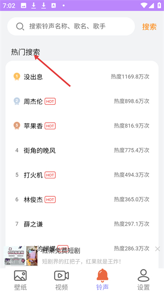 3、熱門搜索頁,展示沒出息、周杰倫、蘋果香、等熱門搜索鈴聲,標注熱度,方便查找。