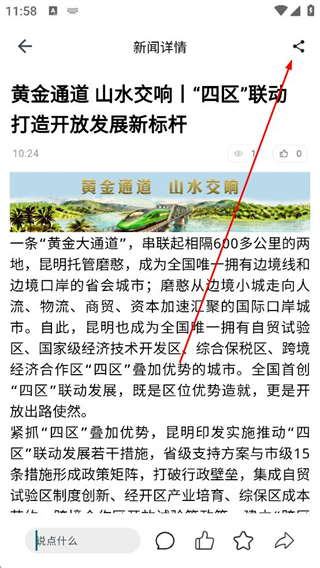 3、在新聞詳情頁閱讀新聞內容了解相關信息,查看新聞發布時間等內容,找到分享相關按鈕,點擊后彈出分享選項界面。