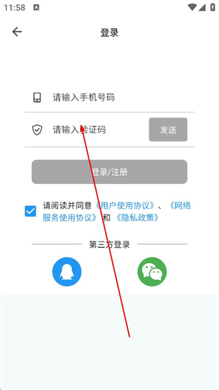 1、進入平臺登錄頁面,在手機號輸入框填寫號碼,點擊發送按鈕獲取驗證碼,將驗證碼填入對應輸入框,勾選相關協議后點擊登錄注冊按鈕。