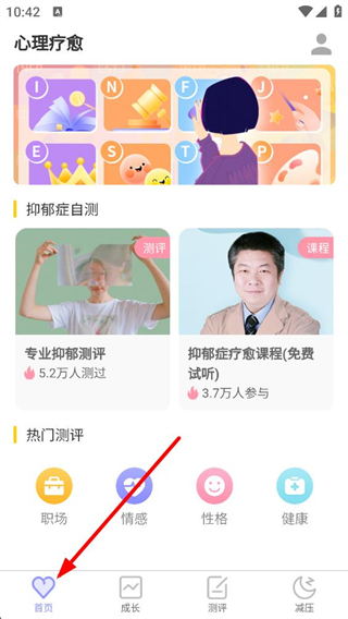 1、進入應用首頁可看到心理療愈相關內容,包含抑郁癥自測及熱門測評板塊,點擊職場分類,即可進入職場相關測評頁面。