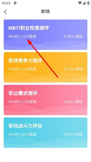 2、職場頁面可選擇MBTI職業性格測評等多項測評,這類測評有較高的用戶認可度,能幫助了解自身職場相關的性格特質。