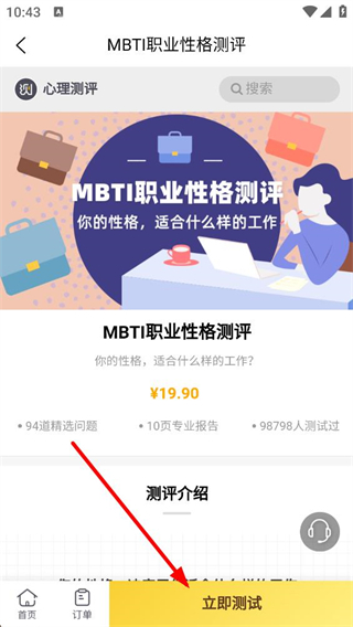 3、進入MBTI職業性格測評詳情頁,可查看測評價格及包含的精選問題、專業報告等信息,點擊立即測試按鈕,即可進入測試流程。