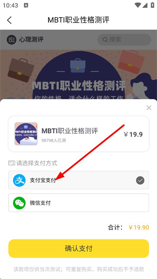 4、點擊立即測試后會進入支付界面,可選擇支付寶或微信支付方式,確認支付金額后點擊確認支付,完成支付即可參與測評。
