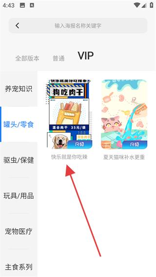 2、在海報頁面,查看養寵知識、罐頭零食等分類,點擊更多,瀏覽各類海報模板,了解模板的風格與適用場景,挑選感興趣的海報模板。