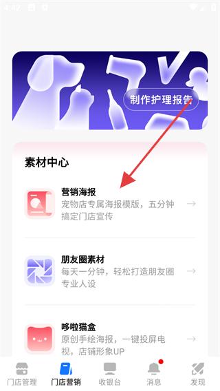 1、進入軟件門店營銷頁面點擊營銷海報,進入素材中心,了解寵物店專屬海報模板,可五分鐘搞定門店宣傳,挑選適合的海報制作方向。