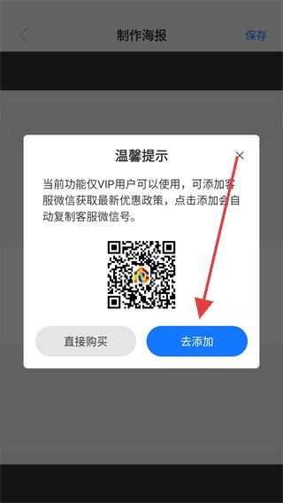 4、若使用VIP模板制作海報會出現溫馨提示,可選擇直接購買或去添加客服微信獲取優惠政策,開通VIP后即可使用該功能制作海報,提升門店宣傳效果。