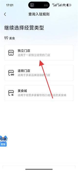 4、進入查詢入駐規則頁面繼續選擇經營類型,如獨立門店,了解其入駐的具體規則,明確資質提交的要求,全面掌握入駐的規范,保障入駐流程的順利進行。