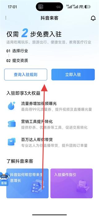 1、進入軟件入駐頁面查看僅需2步免費入駐的流程,了解入駐享有的流量券曝光、營銷工具轉化、達人帶貨三大權益,點擊立即入駐,開啟入駐流程。