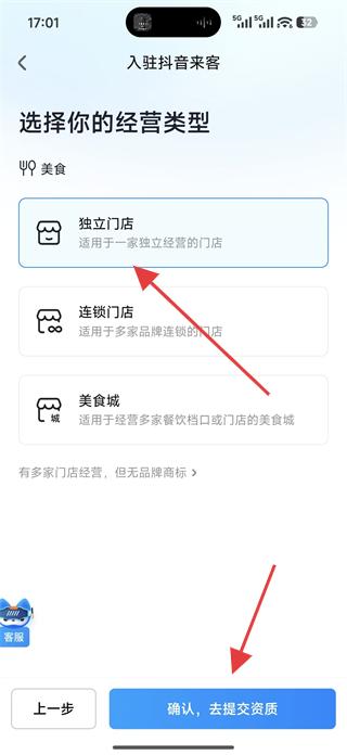 3、選擇經營類型如獨立門店,了解其適用于一家獨立經營的門店,點擊確認去提交資質,確定經營的具體類型,推進入駐流程。