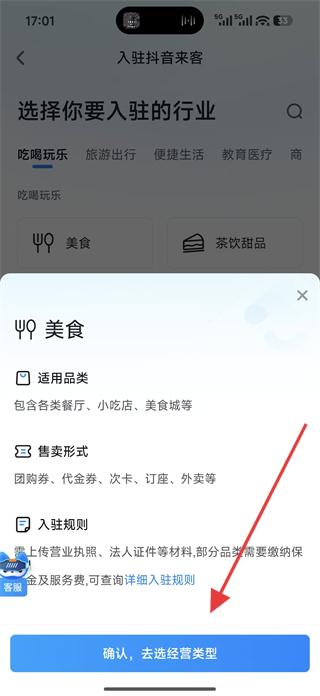 2、選擇要入駐的行業如美食類,了解其適用品類、售賣形式及入駐規則,點擊確認去選經營類型,明確行業的經營要求,為后續入駐做準備。