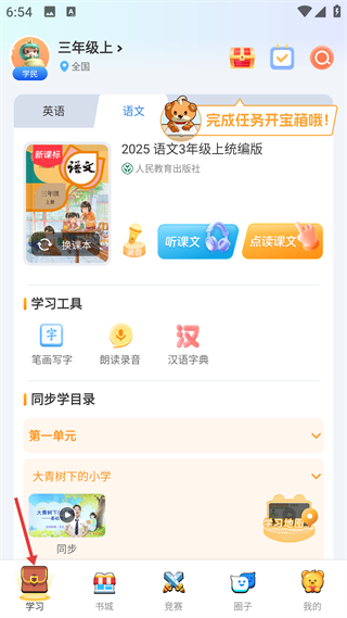 1、同步學習模塊提供三年級語文統編版同步內容,含聽讀工具及筆畫寫字等輔助功能,適配課內知識鞏固需求。
