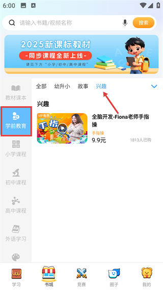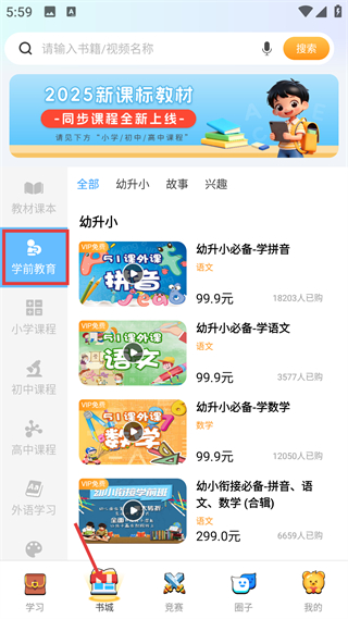 2、書城學前教育類目展示幼升小拼音語文等課程,標注價格與購買量,是多階段課程的展示與購買入口。