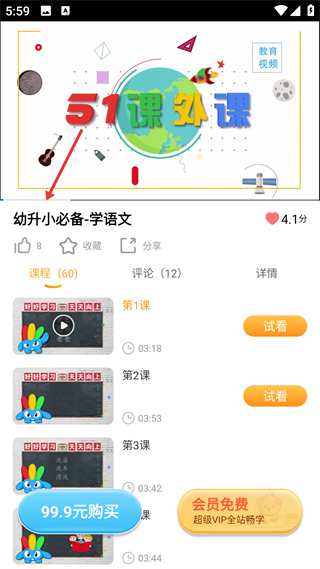 3、課程詳情模塊呈現幼升小語文課程課時,支持試看購買或會員學習,配套收藏分享等互動功能。