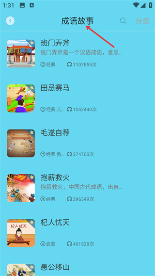 2、成語故事界面展示班門弄斧等經典內容,標注簡介及播放量,便于用戶快速選擇感興趣的成語故事進行啟蒙學習。