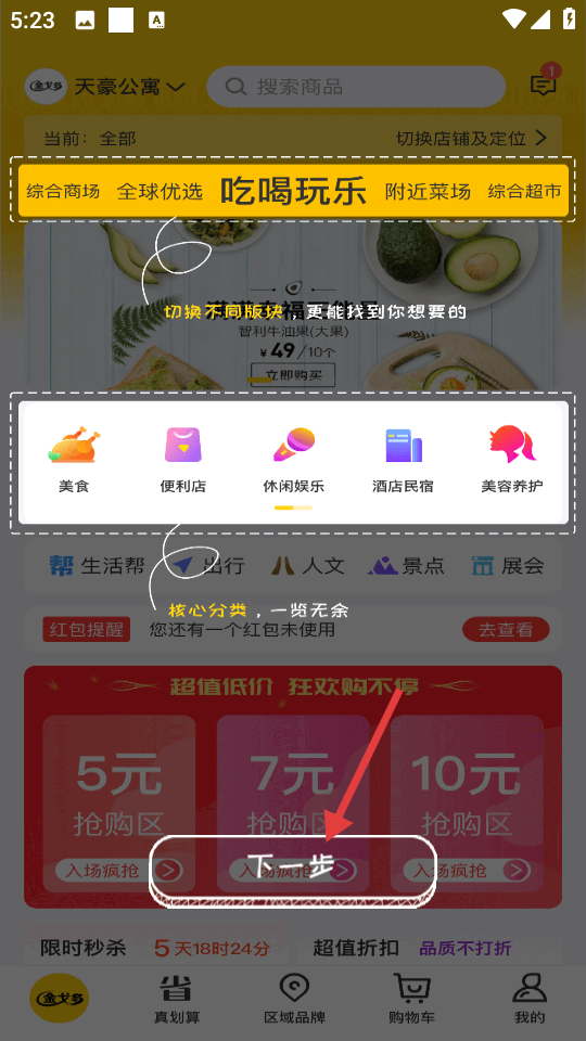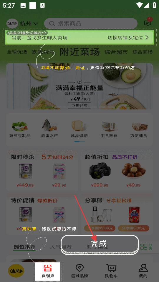 2、完成按鈕用于結束引導流程,頁面通過氣泡提示切換不同菜場、地址找店等,展示附近菜場分類、限時秒殺等功能,幫助新用戶熟悉平臺操作,點擊完成引導流程結束。