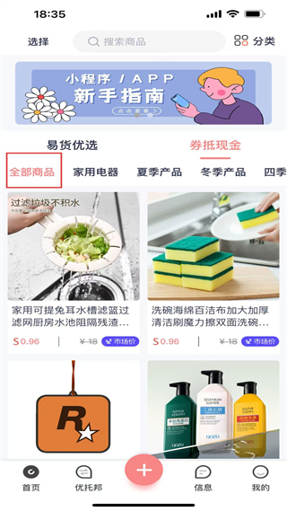 1、進入游戲先看到易貨優選的首頁界面,頂部有搜索欄和分類按鈕,展示全部商品里的水槽濾籃、洗碗海綿等物品,底部有首頁等按鈕,開啟商品選購的流程。