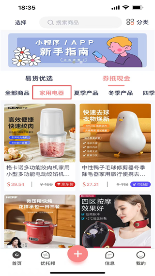 2、切換到家用電器分類頁面,展示格卡諾絞肉機、鴨子毛球修剪器等家電商品,可查看這些商品的價格及相關信息,了解家電類物品的詳情。