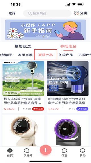 3、切換到夏季產品分類頁面,展示格卡諾循環扇、噴霧制冷風扇等夏季用品,能查看這些商品的價格與介紹,了解夏季類物品的具體內容。