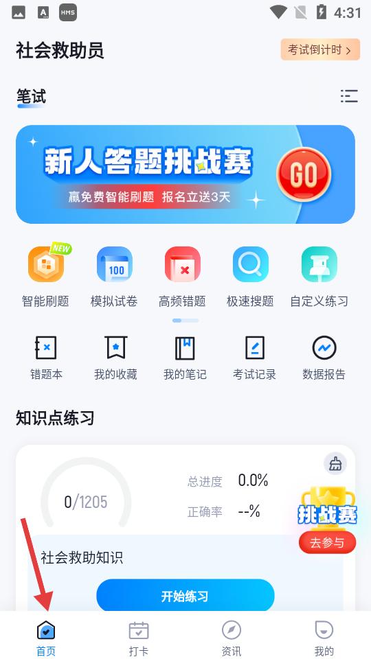 1、點擊首頁,有智能刷題、模擬試卷等功能區,新人答題挑戰賽引人注目,可開啟知識點練習。
