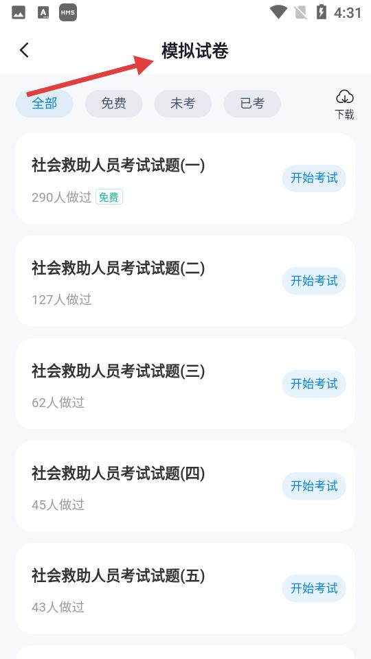 2、點擊模擬試卷頁面,羅列多套社會救助人員考試試題,顯示做題人數及免費標識,方便考生按需選擇測試。