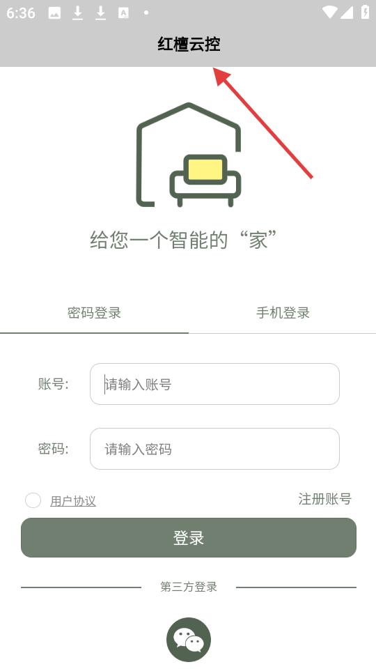 2、點擊登錄頁面,品牌標識為紅檀云控,有密碼和手機兩種登錄方式,下方設有注冊賬號入口及第三方登錄選項。