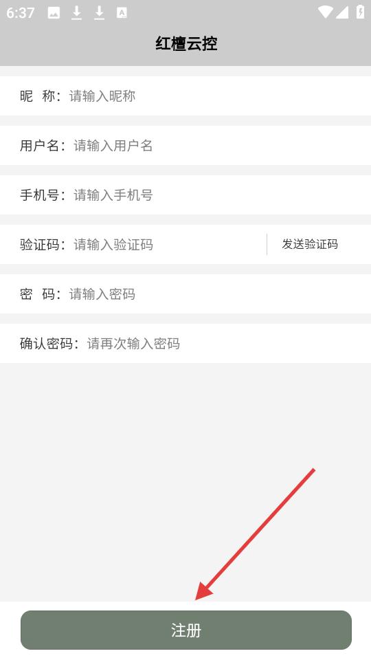 3、點擊注冊界面,明確紅檀云控品牌,需依次填寫昵稱、用戶名、手機號等多項信息,完成后點擊注冊按鈕。