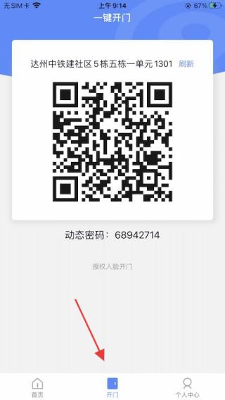 2、點擊開門頁面,顯示達州中鐵建社區單元信息,提供二維碼與動態密碼,可授權人臉開門。