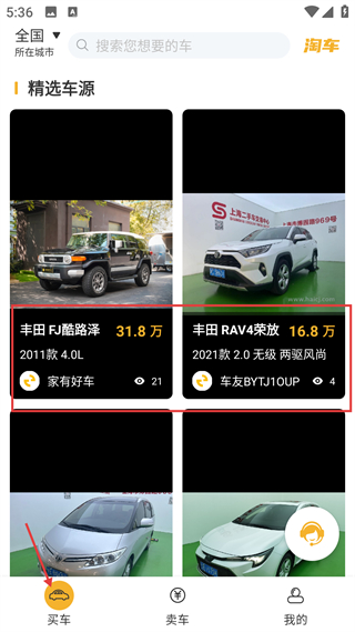 2、豐田車源頁,呈現FJ酷路澤、RAV4榮放等車型,明確價格、配置信息,幫助用戶篩選豐田系的二手車源。