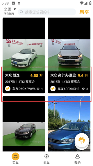3、大眾車源頁,展示朗逸、高爾夫?嘉旅等車型,標注價格、年份配置,助力用戶查找大眾品牌的二手車資源。