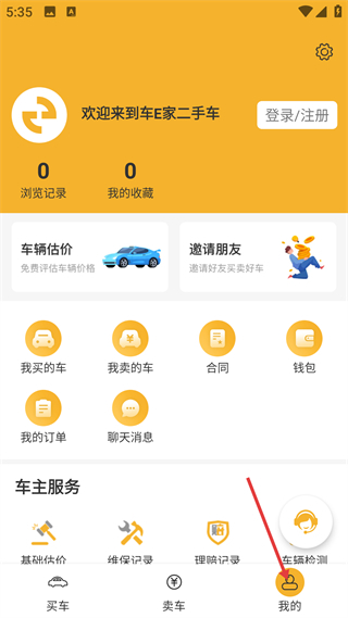 4、個人中心頁,提供車輛估價等功能,含瀏覽記錄等信息,還有車主服務板塊,便于管理二手車交易事務。