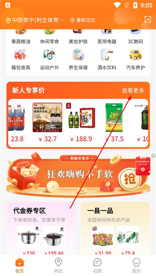 2、登錄后進入首頁可瀏覽各類商品分類,點擊新人專享價的查看更多按鈕,進入新人專享商品頁面,查看專屬優惠商品。