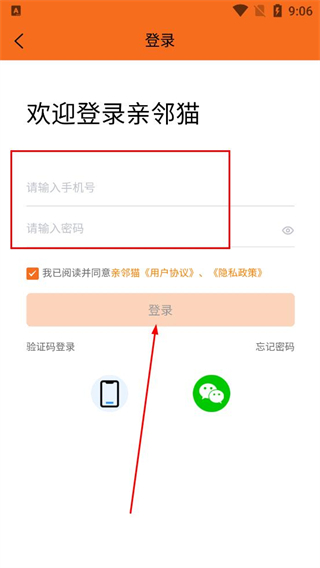 1、打開親鄰貓軟件,進入登錄頁面,輸入手機號和密碼,勾選用戶協議與隱私政策,點擊登錄按鈕,完成賬號登錄。