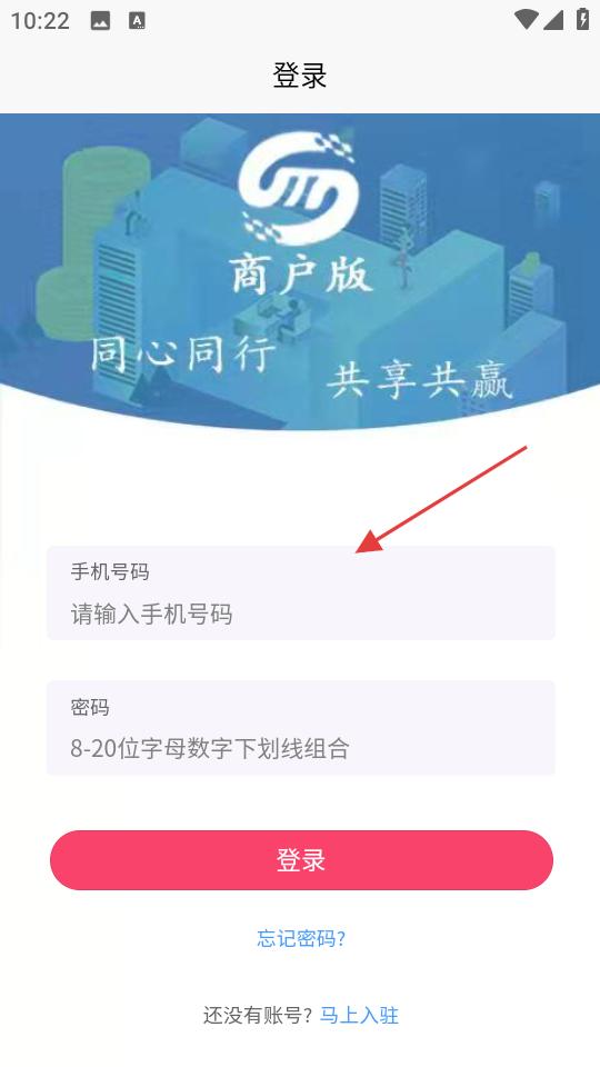 2、登錄界面,用戶輸入手機號碼和密碼即可登錄,若忘記密碼可點擊忘記密碼找回。